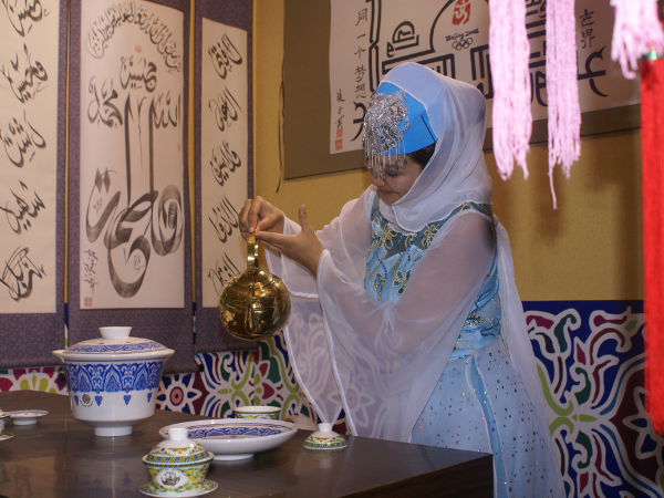回族飲料非常講究,凡是不流的水、不潔凈的水均不飲用。無(wú)論西北東北或西南,也無(wú)論是城鎮(zhèn)或農(nóng)村,只要到回族家做客,熱情的主人都會(huì)首先端上一碗熱騰騰的釅茶?;刈逡埠苤v究茶具,不少家庭都備有成套的各式各樣的茶具。過(guò)去煮茶或沏茶所用的壺,一般都由銀和銅制做,形式多樣,別具一格,有長(zhǎng)嘴銅茶壺、銀鴨壺、銅火壺等?,F(xiàn)在沏茶一般都用瓷壺、蓋碗或帶蓋瓷杯,煮茶多用錫鐵壺,夏天講究用紫砂壺。
