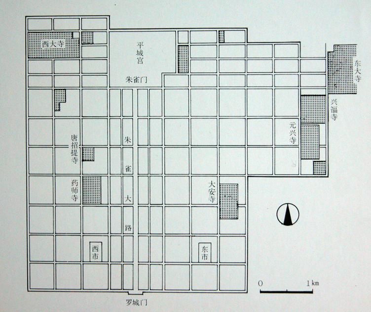 平城京在規(guī)模上繼承了藤原京,面積大致相同,東西約5.9km、南北約4.8km,其形制主要模仿唐長安城。全城平而呈長方形,宮城在北部中央。南面正中設(shè)象征性的都城正門——羅城門。羅城門與宮城的朱雀門相對,朱雀大路縱貫?zāi)媳?,全長約3.8km,寬72m。而此朱雀大路正好將全城分為東西兩部分,分別稱左京和右京。京城內(nèi)有里坊與商市(即東市和西市)。這些設(shè)置和街道的名稱都和唐長安一模一樣,但總體面積僅為唐長安城的四分之一(圖二十一)。