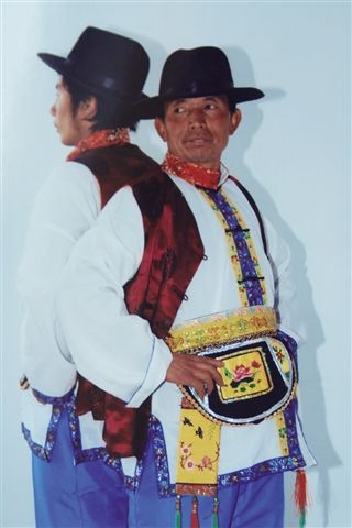 土族的服飾具有獨特的民族風(fēng)格,青壯年男子,戴有綿鑲邊的氈帽,也有的戴“鷹嘴啄食”的氈帽,身穿小領(lǐng),斜襟、袖口鑲有黑邊胸前鑲一塊四寸方塊的彩色圖案的長袍,還穿繡花高領(lǐng)的白色短褂,外套黑色或紫紅色的坎肩,腰系繡花長帶,穿大襠褲,系兩頭繡花的長褲帶和花圍肚,小腿扎“黑虎下山”(上黑下白)的綁腿帶,穿花云子鞋。老年人一般頭戴黑色的卷邊氈帽,穿小領(lǐng)、斜襟長袍,外套黑色坎肩,系黑色腰帶,腳穿白襪黑鞋。